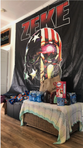 The "ZEKE Till the Living End Tour Back Drop" is a vinyl Back Drop.by artist ZEKE, This Back Drop was displayed at Live Events World Wide while performing on Tour With MOTORHEAD, PEARL JAM CORROSION of CONFORMITY VOO DOO GLOW SKULLS and More. It is in EXCELLENT condition. No Tears or Blemishes. 8ft X 8ft